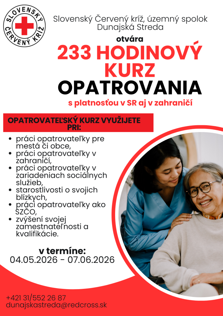 Nasledujúci termín 233 hod. kurz opatrovania začína od 04.05.2026 do 07.06.2026 pre samoplatcov alebo možnosť preplatenia cez UPSVaR v Dunajskej Strede pre UoZ a ZoZ. Pre nezamestnaných platí 30 dní pre začatím kurzu pred nástupom na kurz predložiť UPSVaR tlačivá (do 03.04.2026)