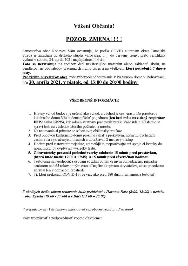 Testovanie v piatok v našej obci